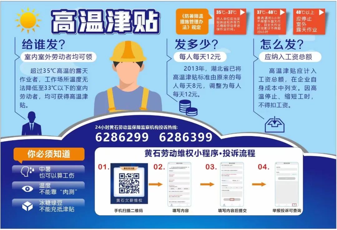 根据有关规定,用人单位安排劳动者在35°C以上高温天气从事室外露天作业以及不能采取有效措施将工作场所温度降低到33°C以下的,应向劳动者发放高温津贴,并纳入工资总额。我市高温津贴执行时间为6、7、8、9四个月,执行标准为每人每天12元。未享受者可拨打劳动保障监察机构投诉热线0714-6286299、6286399维权,或使用手机微信“扫一扫”即可进入“欠薪线索反映”微信小程序,填写相关信息,点击提交完成投诉举报。