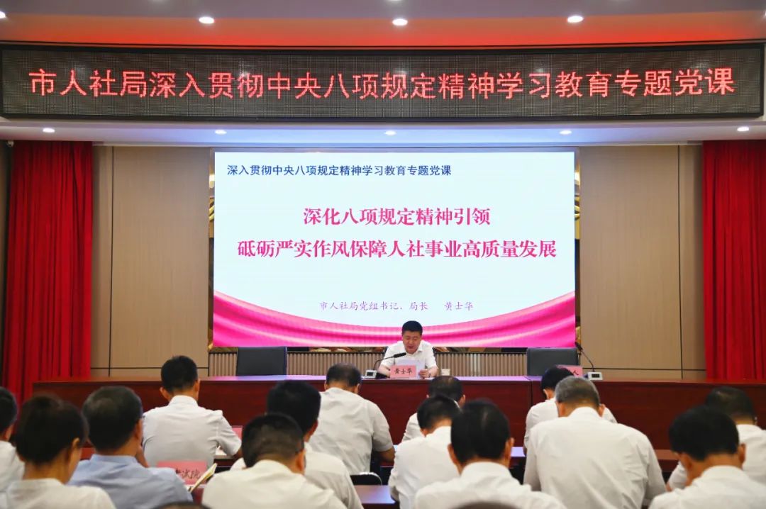 局党组书记、局长黄士华以《深化八项规定精神引领,砥砺严实作风保障人社事业高质量发展》为题讲授专题党课,围绕学习习近平总书记关于加强党的作风建设重要论述的收获感悟、贯彻落实中央八项规定精神的成效经验、违反中央八项规定精神的危害、推动改进作风的实际举措四个方面,结合人社工作实际进行了深入浅出的讲解。