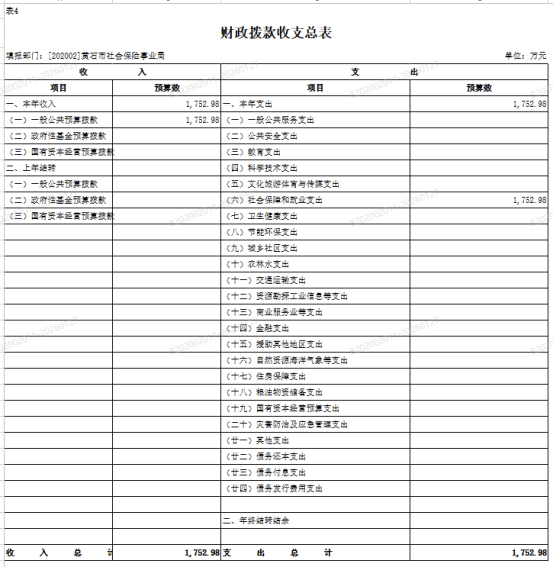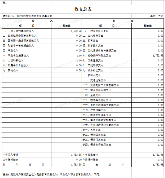 按照综合预算的原则,黄石市社会保险事业局所有收入和支出均纳入部门预算管理。收入包括:一般公共预算拨款收入、政府性基金预算拨款收入、国有资本经营预算拨款收入、财政专户管理资金收入、事业收入、事业单位经营收入、上级补助收入、附属单位上缴收入、其他收入;支出包括:一般公共服务支出、社会保障和就业支出、其他支出;2026年度收支总预算1752.98万元。