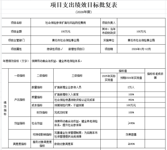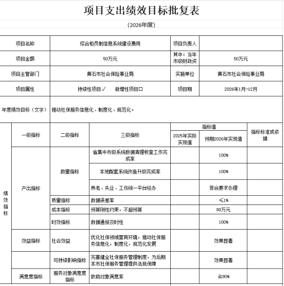 (7)2026年度项目绩效总目标是:及时将参保人员的信息反映到数据库,并为广大参保企业和个人提供更为优质、快捷的服务。