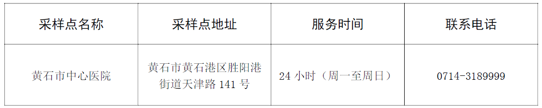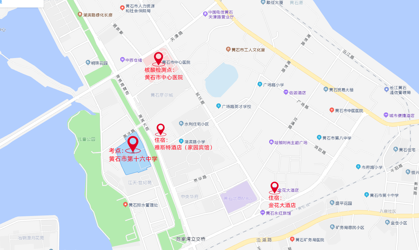 为方便来黄参考考生进行核酸检测采样,在以上两家酒店(宾馆)住宿且未做核酸检测的考生可在考生接待处进行登记后统一进行核酸检测。其他考生可在黄石市中心医院进行核酸检测采样,采样过程中,请规范佩戴口罩,保持“一米线”安全距离,听从采样点工作人员安排,安全有序采样。如异地考生抵黄时间较晚的,建议提前询问采样时间和纸质报告结果领取时间,以免影响参加考试。