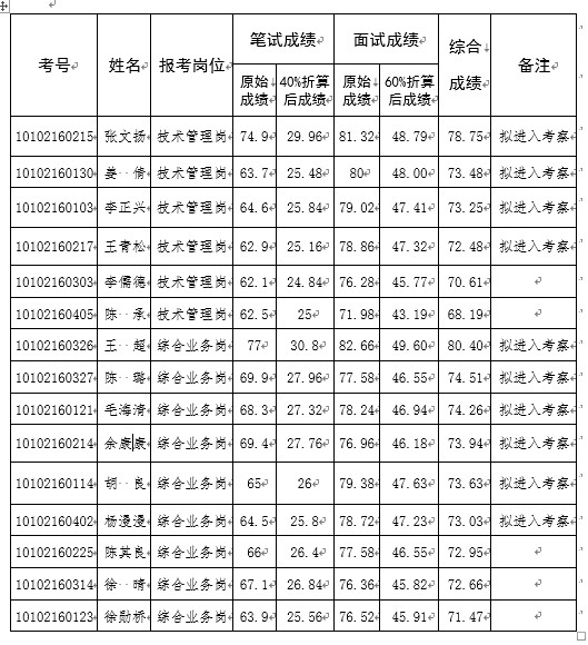 根据《2022年黄石市应急管理局政府雇员招聘公告》有关规定,经笔试、资格复审、面试等程序,依照综合成绩(笔试占40%、面试占60%)从高分到低分,按岗位招聘人数1:2的比例确定考察人员名单,现将笔试、面试、综合成绩及拟进入考察人员名单公告如下: