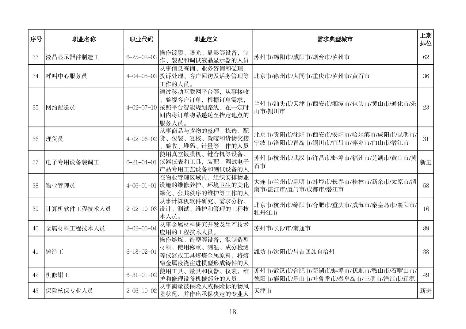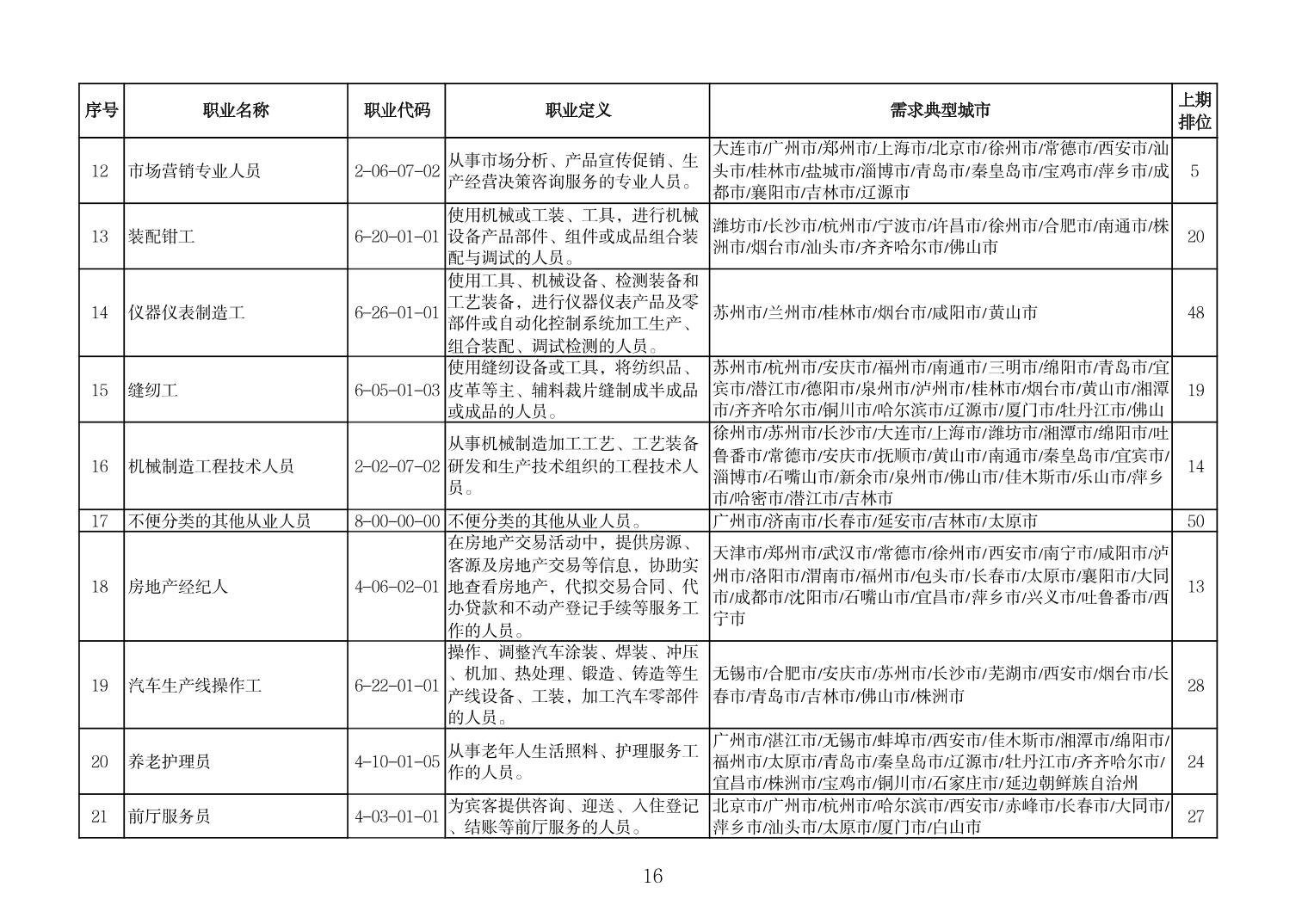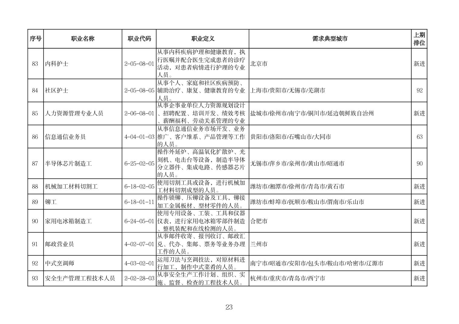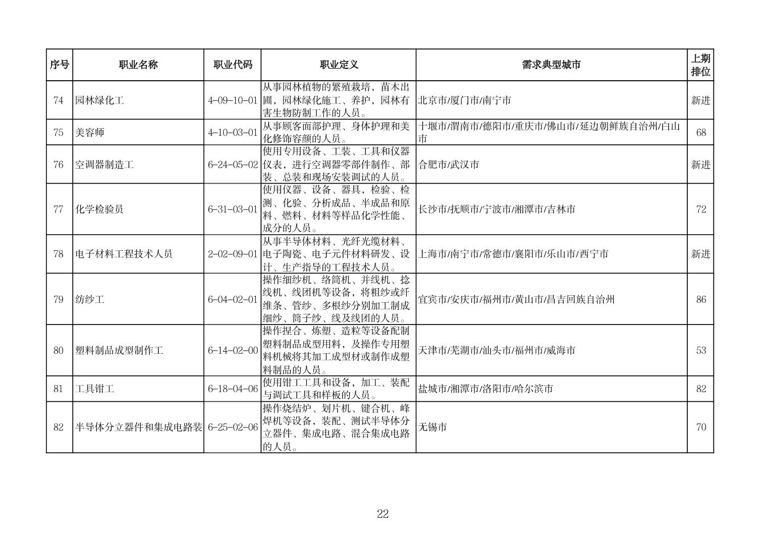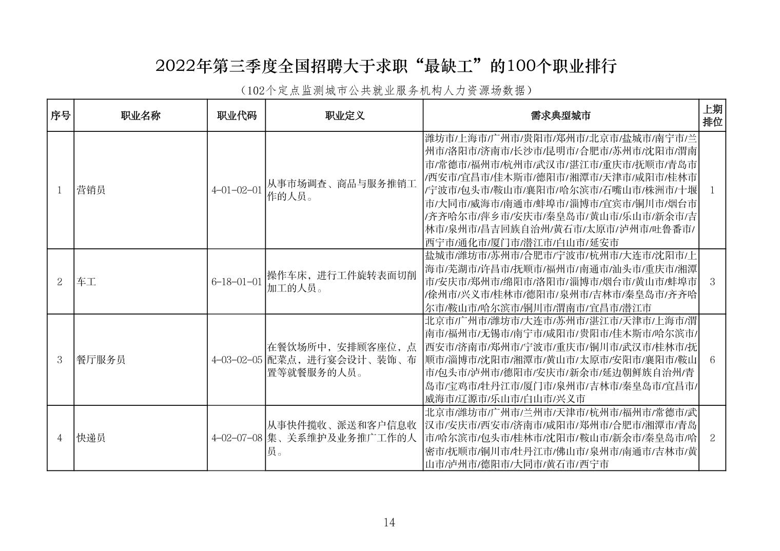 为了更好服务于用人单位招聘用工和劳动者应聘求职,同时为职业技能培训工作提供数据参考,中国就业培训技术指导中心近期组织102个定点监测城市公共就业服务机构,收集汇总2022年第三季度人力资源市场供求关系较为紧张的招聘、求职需求职业岗位信息,形成“2022年第三季度全国招聘大于求职‘最缺工’的100个职业排行”,现向社会公布。