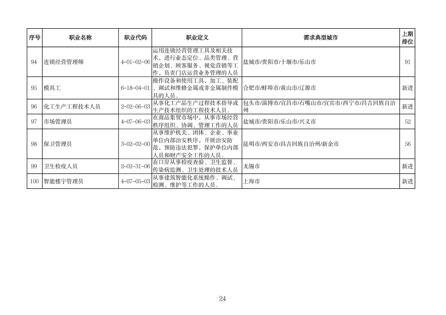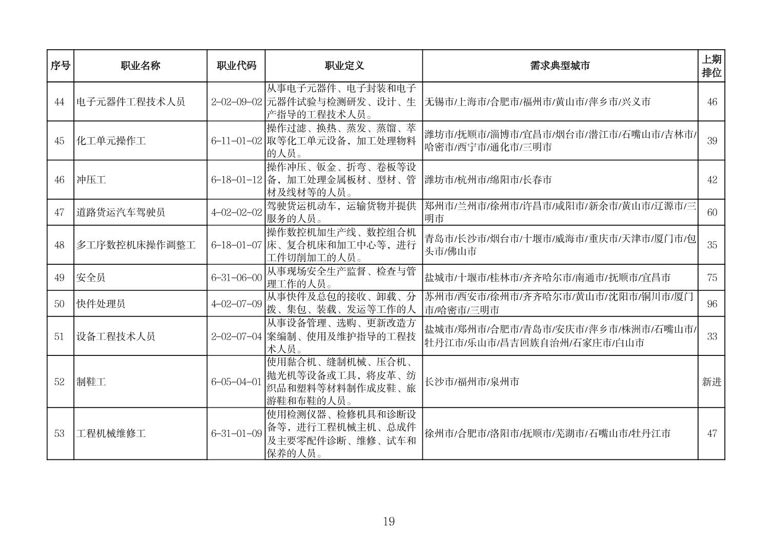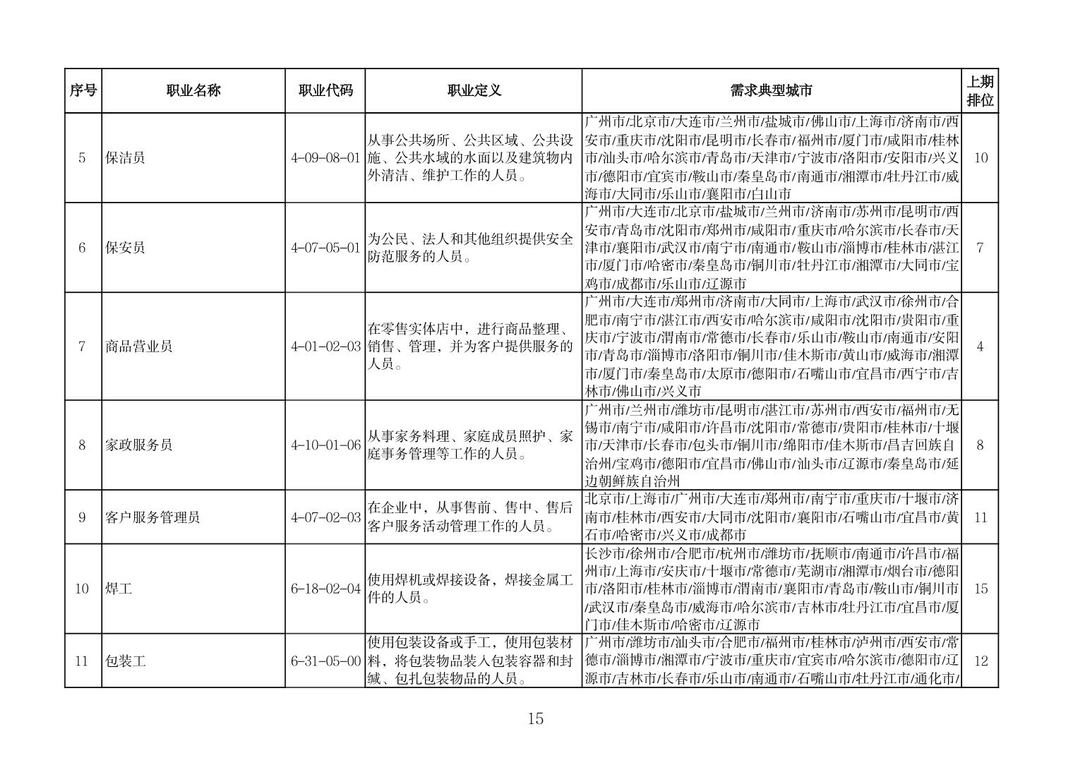 本期数据由“序号”“职业名称”“职业代码”“职业定义”“需求典型城市”“上期排位”六个部分组成。“职业名称”“职业代码”“职业定义”适用《中华人民共和国职业分类大典(2015版)》的职业分类标准。“需求典型城市”是指填报该职业需求的典型城市名单,排在前面的城市需求缺口大于排在后面的城市。“上期排位”表示上期(2022年第二季度)该职业的排位情况。