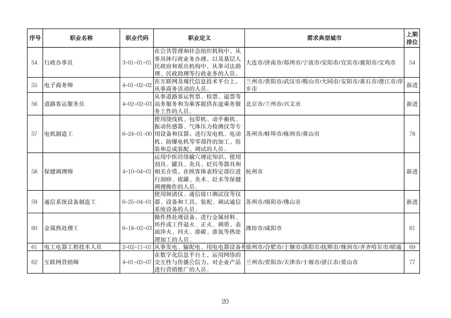 本期数据采集各定点监测城市公共就业服务机构人力资源市场“招聘需求人数”和“求职人数”缺口排名前20的职业岗位信息,综合考量岗位缺口数量、填报城市数量等因素,经加工汇总整理形成,按“招聘需求人数”与“求职人数”岗位缺口数量和填报城市数量加权取值后从大到小排列,排在前面的职业需求缺工程度大于排在后面的职业。