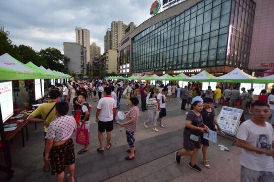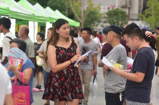 当天傍晚,黄石摩尔城广场上,人流涌动,十分热闹。招聘会的每个展台前都有不少求职者驻足查看招聘信息。这里是黄石商业中心,夏季以来,每到傍晚,不少群众在此纳凉。招聘会前期,通过报纸、微信、QQ群等渠道宣传,招聘会现场人气爆棚。