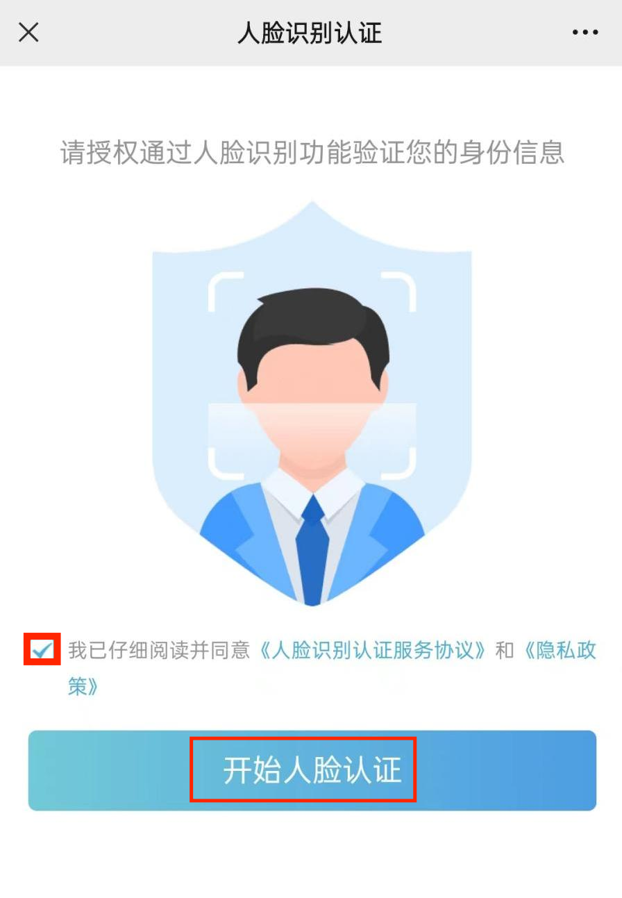 勾选“我已仔细阅读并同意《人脸识别认证服务协议》和《隐私政策》”,并点击“开始人脸认证”。