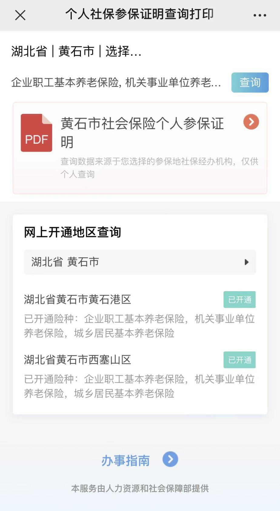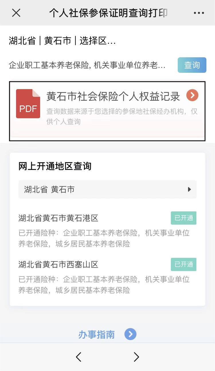 如图,选择“个人社保参保证明打印查询”,即可查询打印“黄石市社会保险个人参保证明”。