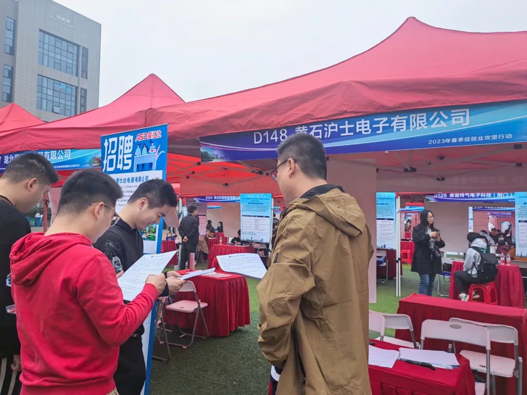 招聘会上,诺德新材料、沪士电子等重点企业带来了300多个就业岗位,涵盖电子IE工程师、技术骨干等多个岗位,为湖工大的应届毕业生提供多元就业选择。上午10点,现场咨询应聘的学生排起了长龙,招聘人员除了向学生推介适配岗位,还直接在现场开展双选交流,对合适的应聘者进行初步筛选,提升招聘效率。张晟是电气与电子工程学院的2023届应届生,尽管手中已经拿到几个就业协议书,他还是参加了这次的招聘会,希望能找到更心仪的工作。