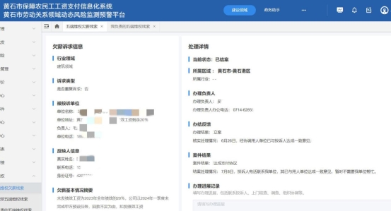 北京某技术有限公司武汉分公司,统一社会信用代码:9142--(略)Y;地址:武昌区东湖路10号水果湖广场(略)楼-号;法定代表人:毛某某。2024年6月6日,投诉人欧某反映在黄石某技术有限公司武汉分公司上班,该用人单位未发绩效工资为2023年全年绩效的20%,公司以2024年一季度未完成甲方预设任务,回款不足为由,扣发绩效工资。6月7日,人社部门通过黄石市劳动关系领域动态监测预警平台(五端维权)(劳动关系领域动态监测预警平台,以下简称:平台)系统向劳动者推送立案短信,告知其人社部门对该案进行立案调查。同时,人社部门利用平台向用人单位推送了短信,要求其主动配合我单位进行调查处理。用人单位主动联系人社部门表示其愿意支付工资,目前由于双方存在纠纷,正在协商解决。7月8日,投诉人电话联系人社部门,其已与用人单位达成一致意见,工资已按双方协商的支付到位。