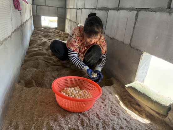 在池塘边一间甲鱼母种产蛋房内,62岁的村民卢春玉正小心翼翼地拨开沙层,仔细搜寻藏匿其中的甲鱼蛋。“我家就在附近,这几年我一直在这里做事,活儿不重,一天还能挣一百多元。我们湾里跟我年纪差不多的都在这里做事,大家一块儿干活,开心着呢。”卢春玉笑着说。
