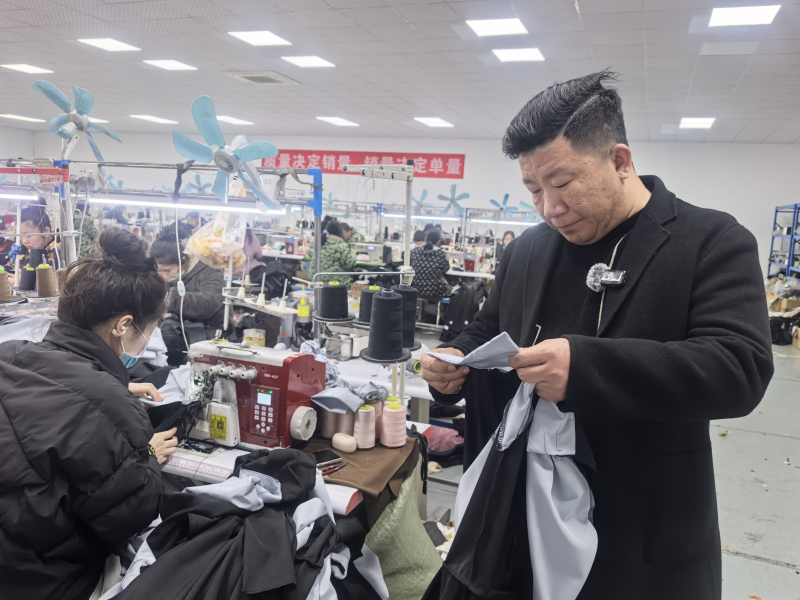 “嗒嗒嗒……”2月4日一大早,天门市小板镇三乡路,瑞鑫制衣厂区内,上百台缝纫机的运转声交织,流水线上,工人们指尖翻飞,布料在针脚间逐渐成型。厂长付雄高穿梭在生产线旁,时而弯腰查看布料缝线,时而俯身叮嘱员工注意工艺细节。
