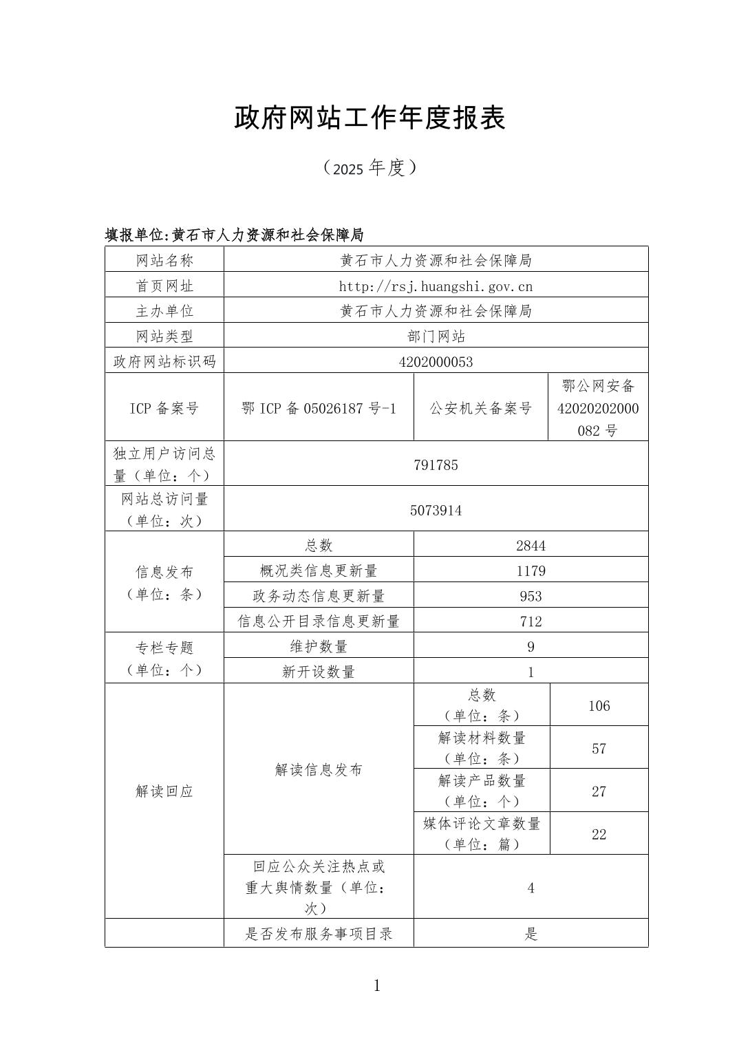 黄石市人力资源和社会保障局网站工作年度报表(2025年度)